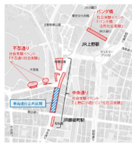 実施エリア:不忍通り(一部区間)および不忍池ほとり(図示の社会実験エリア)
